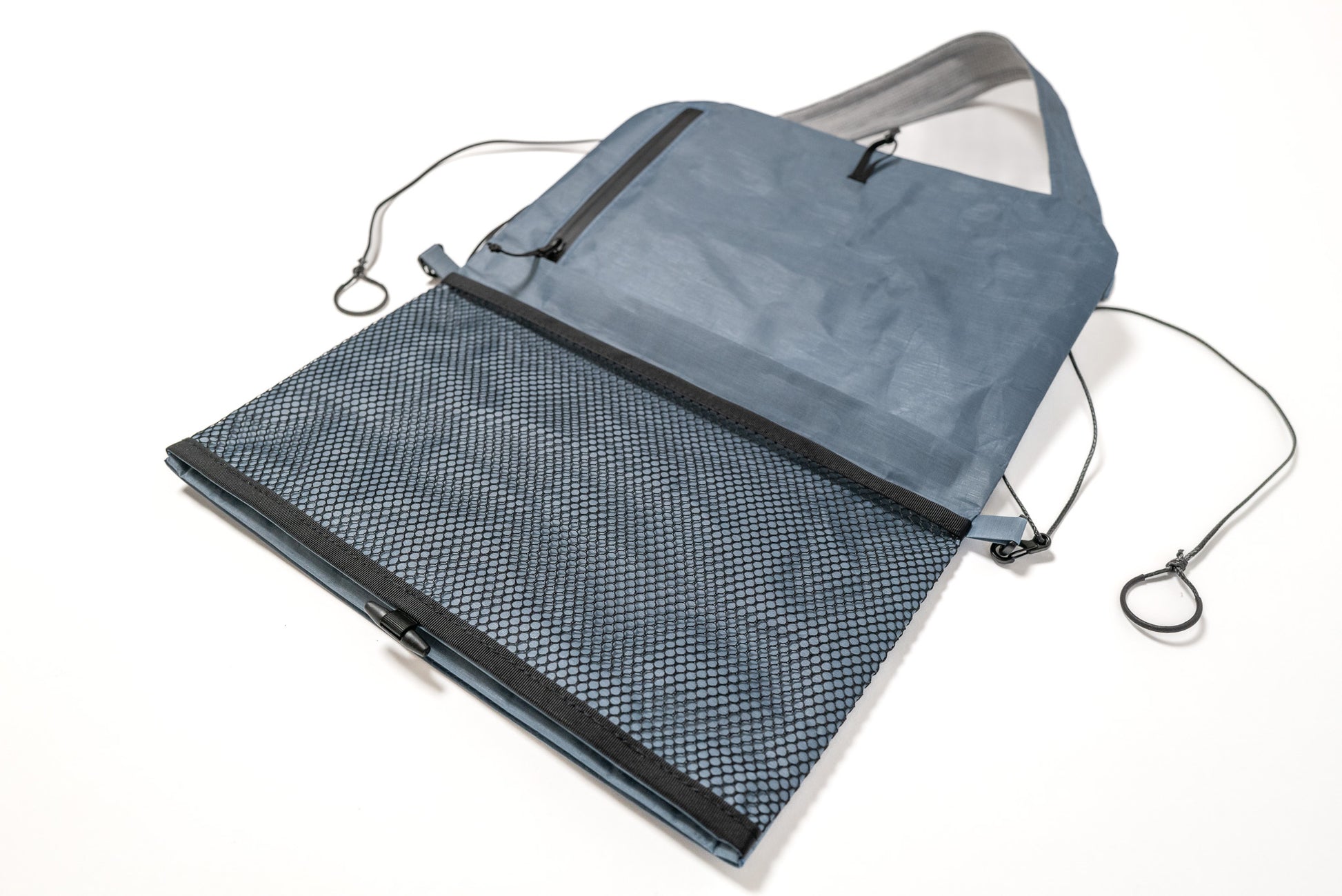 【 U.L. FUN Strap 】の本体、表側は【 U.L. FUN Sacoche 】と同じダイニーマ®コンポジットファブリックの2.92oz/yd2を使っています。裏側は吸水速乾性とUVカット機能を備え、綿のような感触で毛羽立ちを抑える抗ピリング性もあるポリエステル100%の細かいワッフル生地を使用しています。