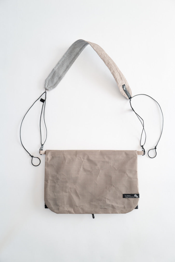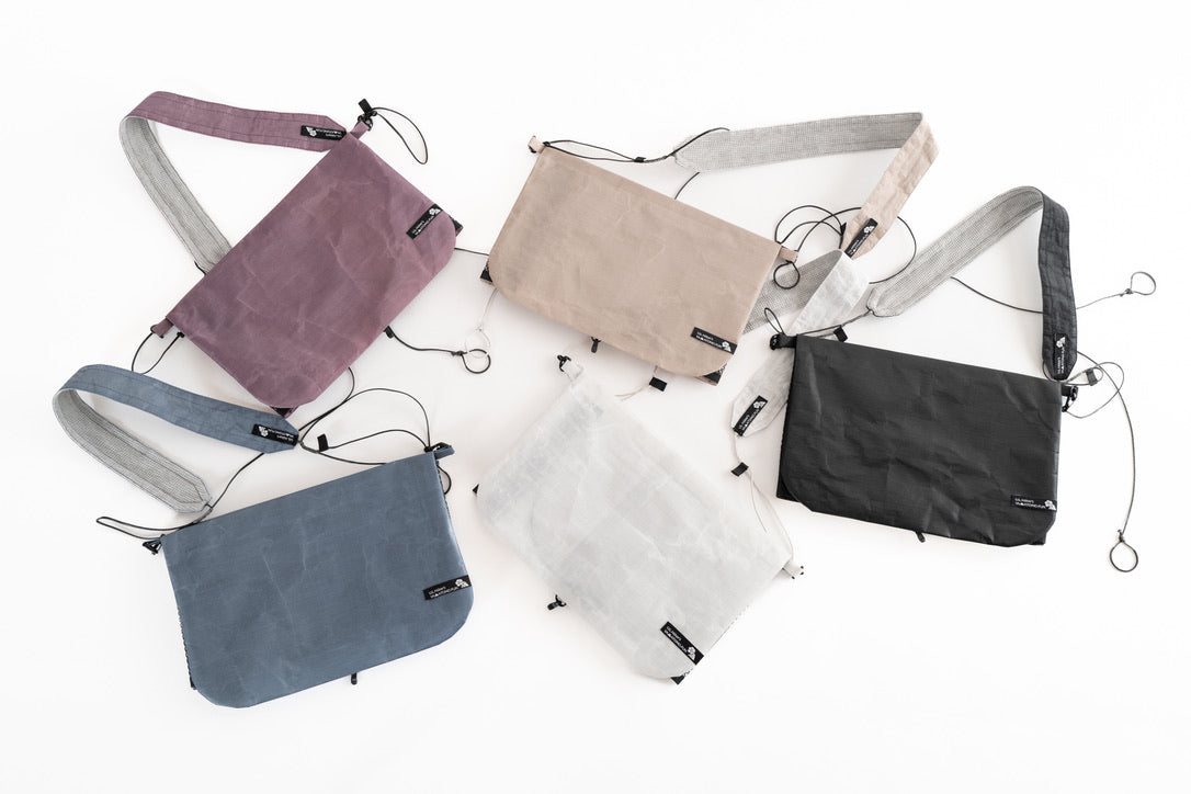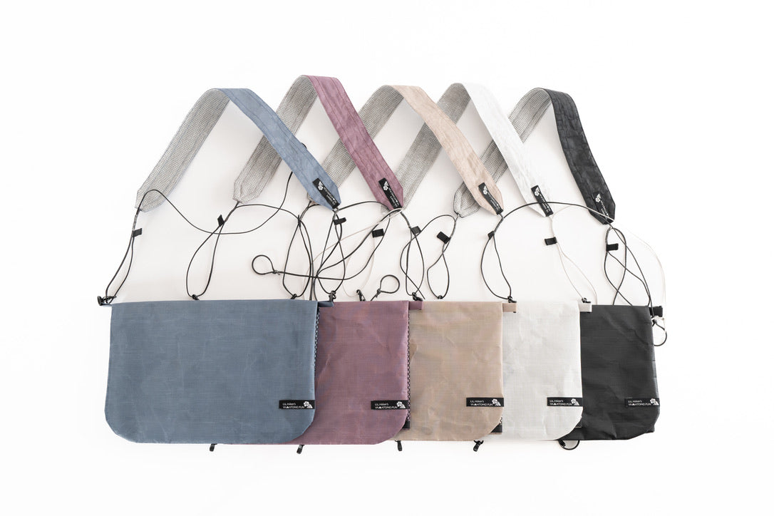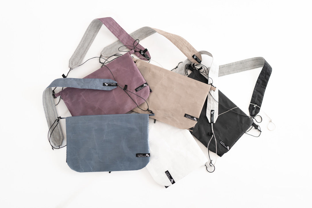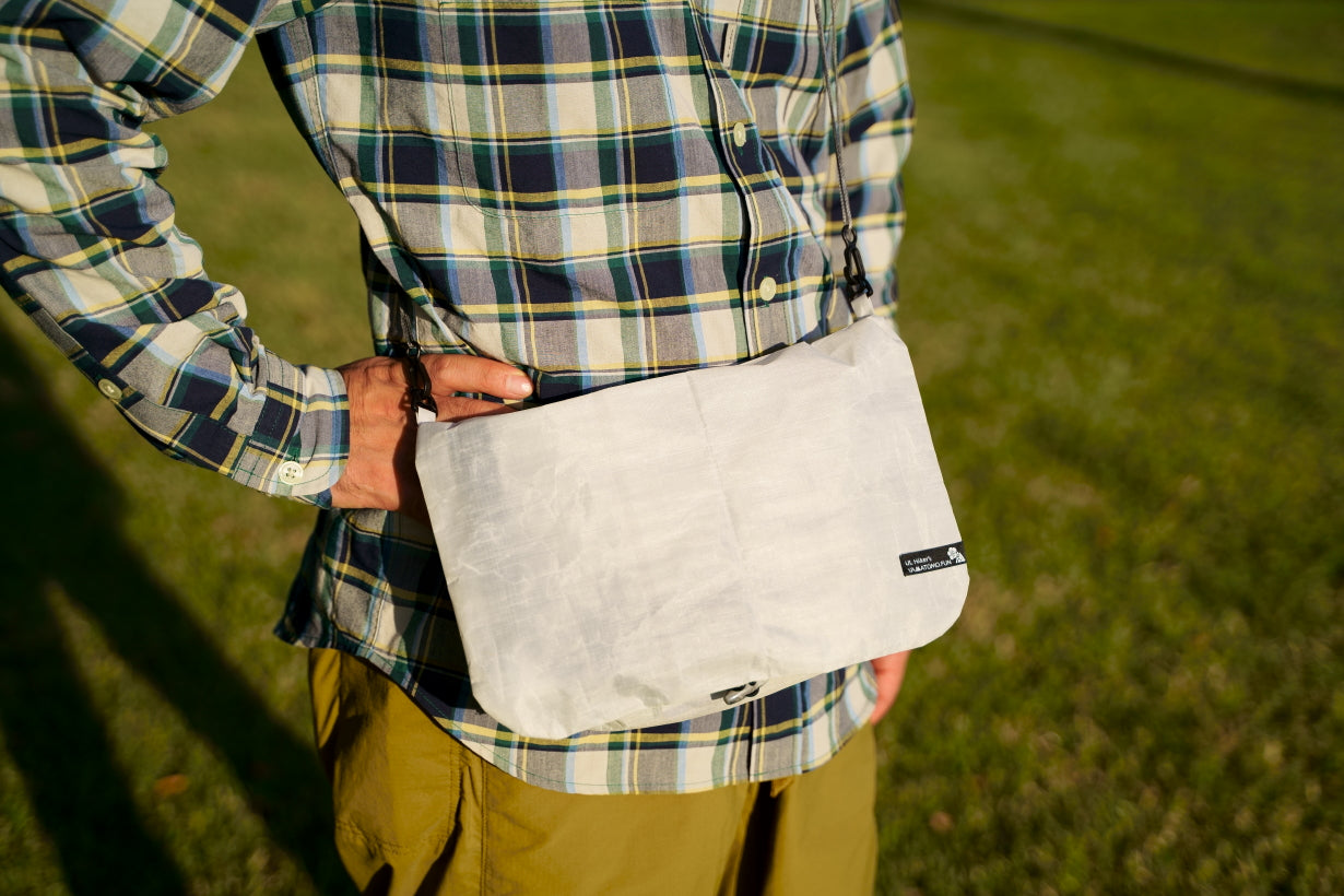 【 U.L. FUN Sacoche 】は、耐水のウルトラライト素材であるダイニーマ®コンポジットファブリックを贅沢に使い、中身が濡れにくい独自のデザインです。また縫製箇所を最小限に抑え、同素材のテープでシールしています。なので登山やハイキングで雨でも、サコッシュの中身が濡れるのを気にすることなく行動できます。