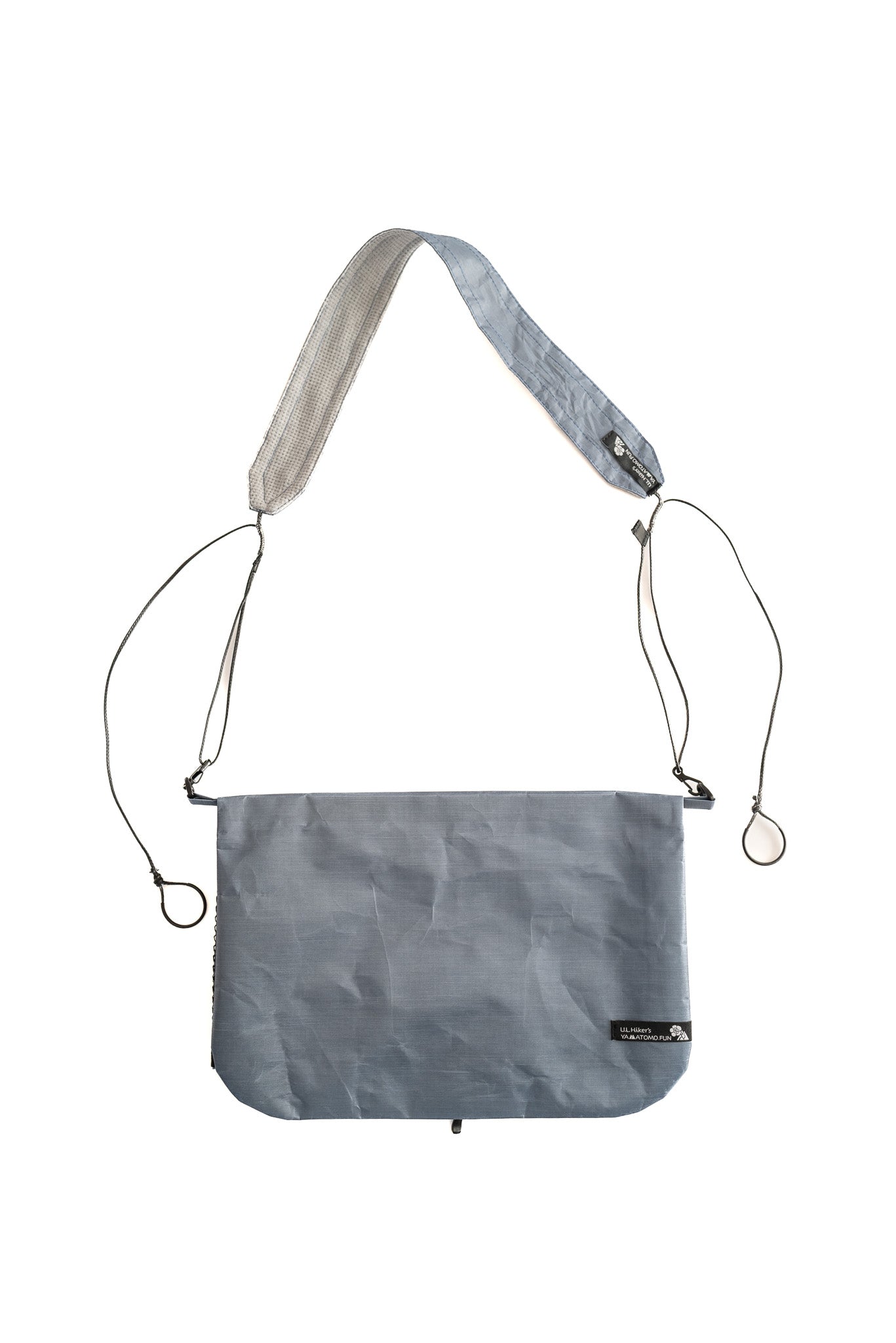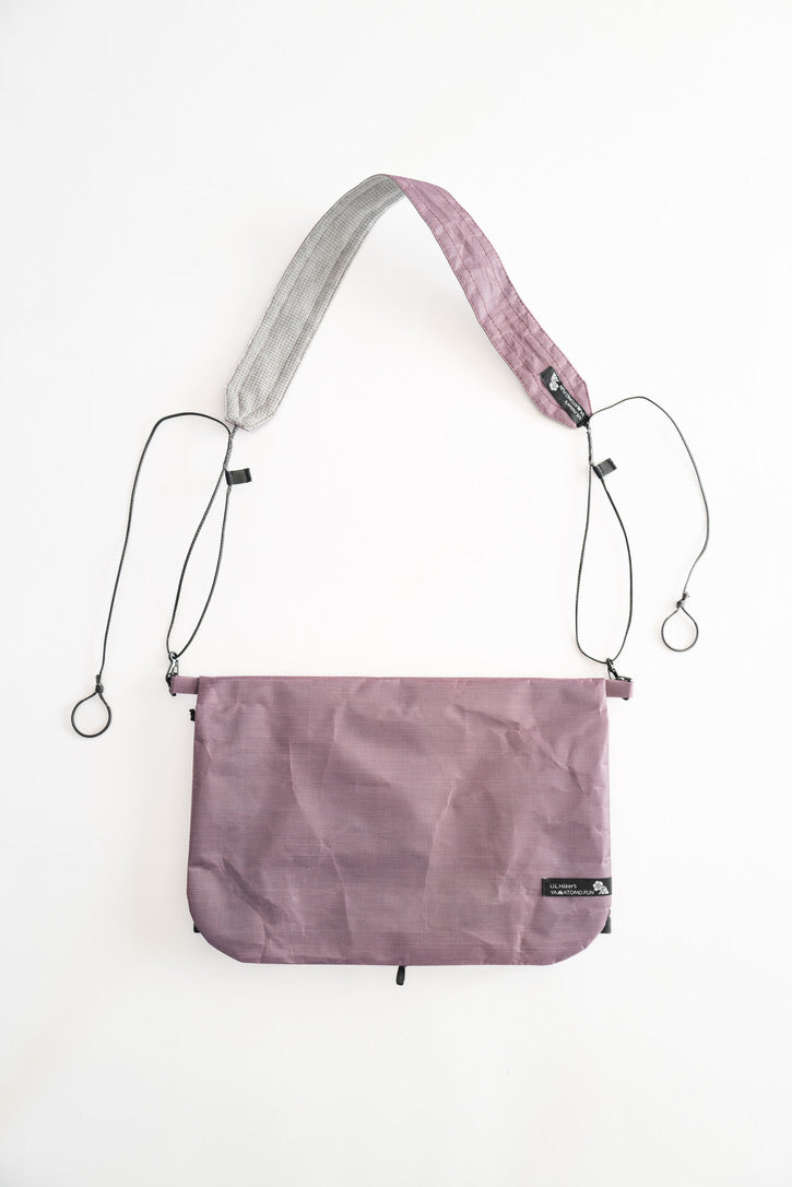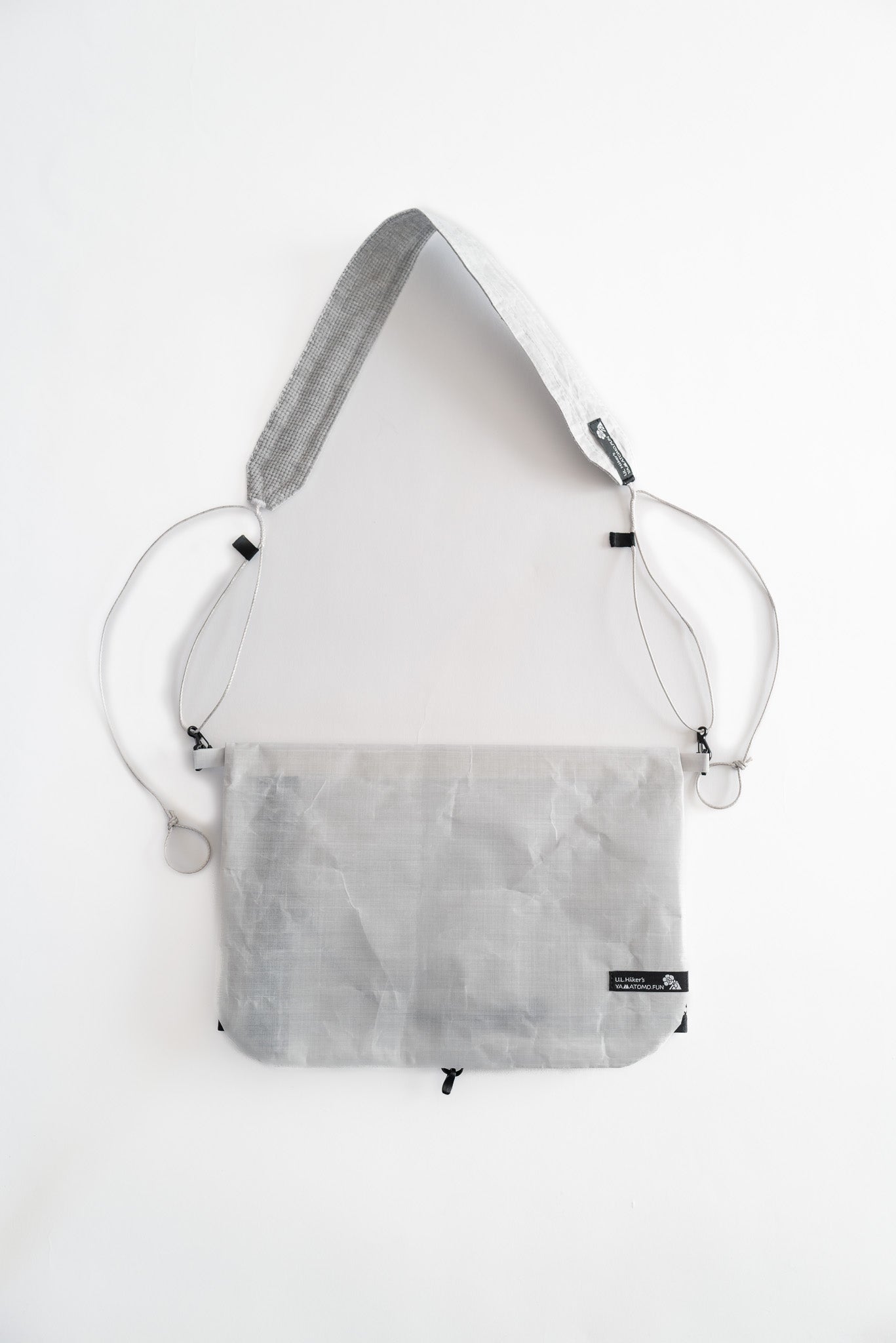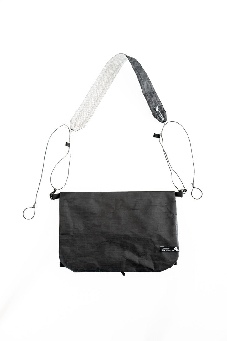 【 U.L. FUN Sacoche 】は、耐水のウルトラライト素材であるダイニーマ®コンポジットファブリックを贅沢に使い、中身が濡れにくい独自のデザインです。また縫製箇所を最小限に抑え、同素材のテープでシールしています。なので登山やハイキングで雨でも、サコッシュの中身が濡れるのを気にすることなく行動できます。